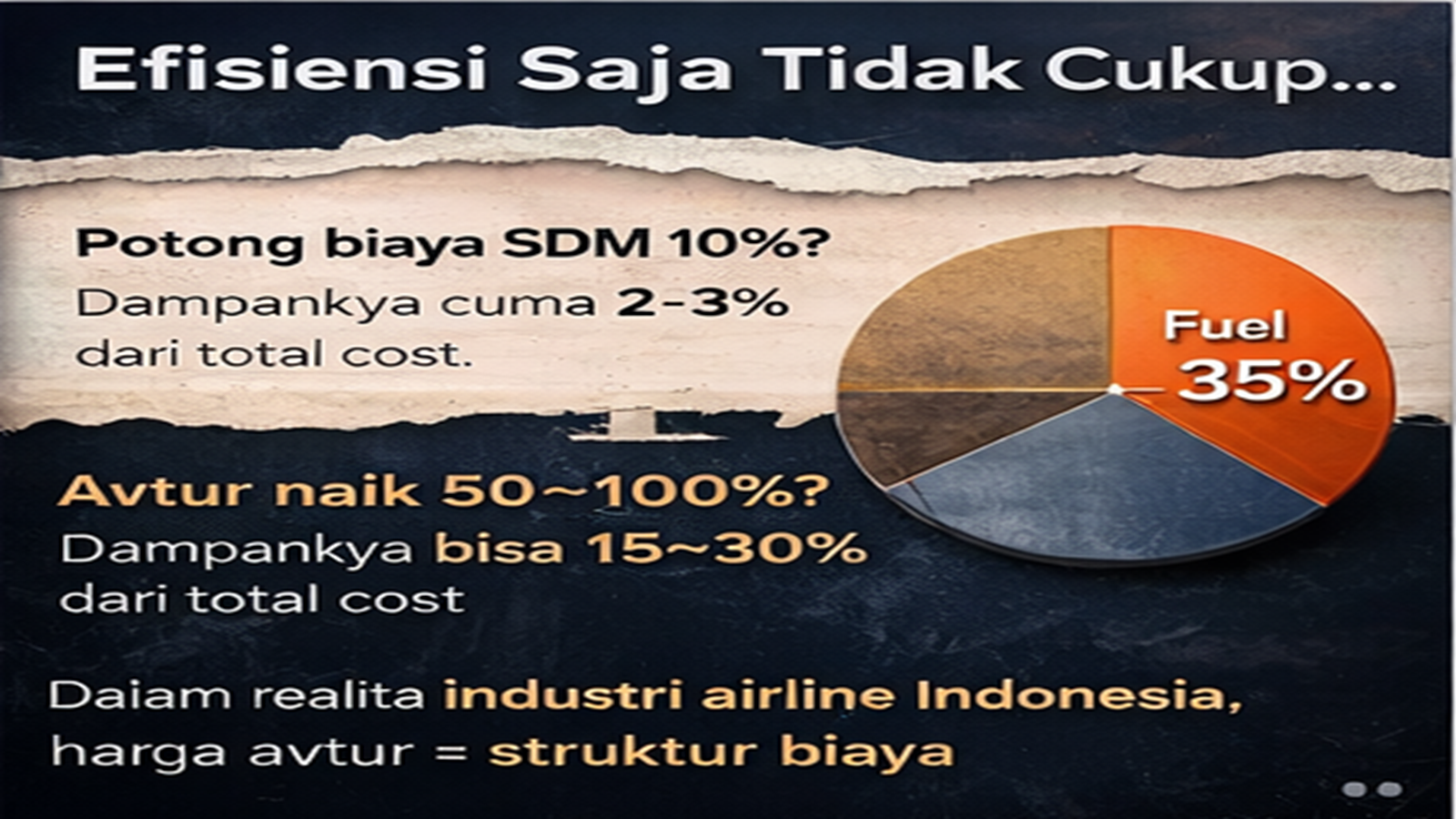 Mari kita lihat secara jujur. Jika maskapai berhasil menurunkan biaya tenaga kerja sebesar 10%, dampaknya terhadap total biaya mungkin hanya sekitar 2–3%. Namun jika harga avtur naik 50% atau bahkan 100%, dampaknya bisa mencapai puluhan persen terhadap total biaya.